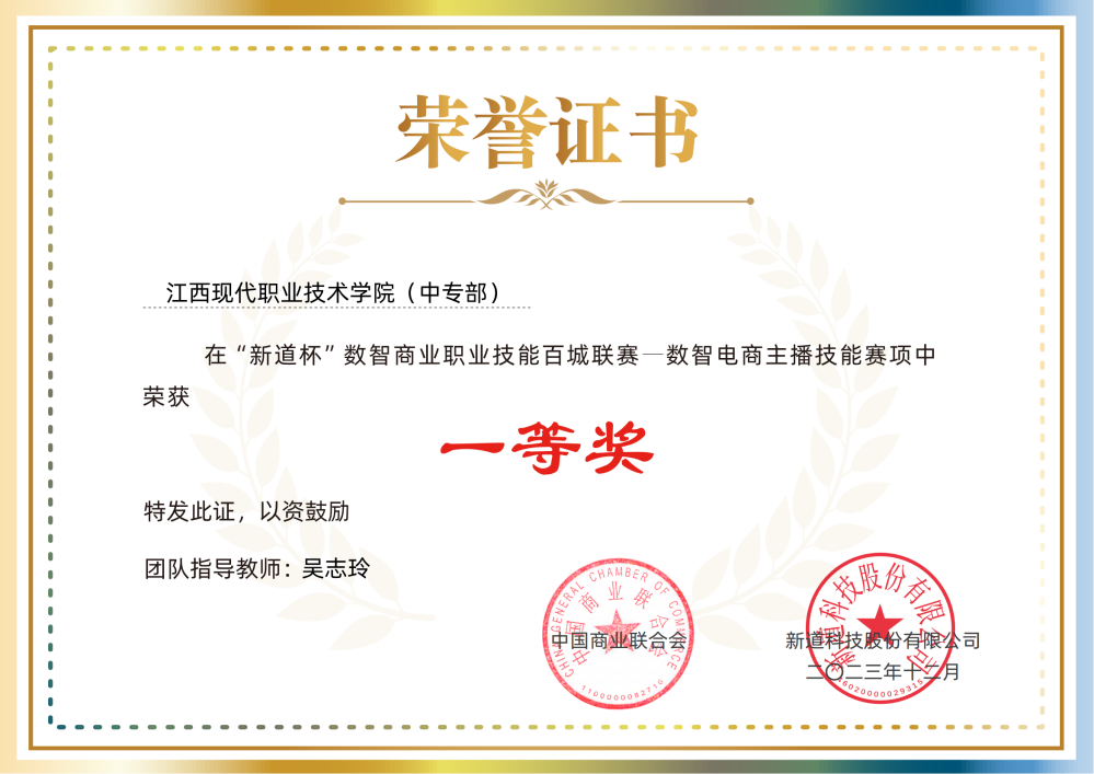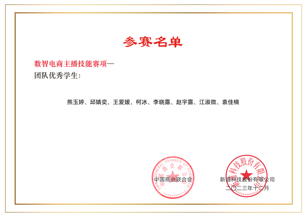 近日,由中國(guó)商業(yè)聯(lián)合會(huì)主辦的“新道杯”數(shù)智商業(yè)職業(yè)技能百城聯(lián)賽數(shù)智電商主播技能賽在線上舉行。由信息管理系吳志玲老師指導(dǎo),熊玉婷等7名同學(xué)組成的參賽團(tuán)隊(duì)榮獲團(tuán)體一等獎(jiǎng),柯冰同學(xué)榮獲個(gè)人一等獎(jiǎng)。
